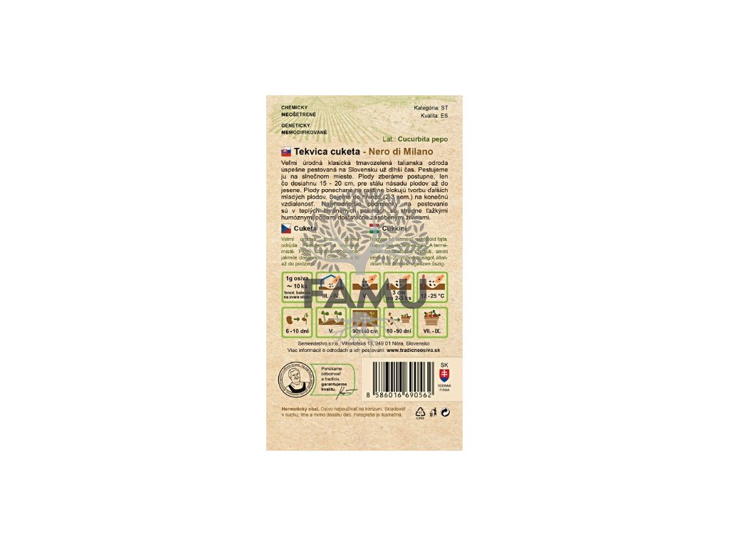 Veľmi úrodná klasická tmavozelená talianska odroda úspešne pestovaná na Slovensku už dlhší čas. Pestujeme ju na slnečnom mieste. Plody zberáme postupne, len čo dosiahnu 15 – 20 cm, pre stálu násadu plodov až do jesene. Plody ponechané na rastline blokujú tvorbu ďalších mladých plodov. Sejeme do hniezd (2-3 sem.) na konečnú vzdialenosť. Najvhodnejšie podmienky na pestovanie sú v teplých chránených polohách so stredne ťažkými humóznymi pôdami dostatočne zásobenými živinami. Obsah balenia: 2 g Počet semien v 1g: cca 5 - 8 ks