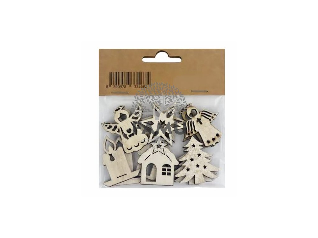 Vianočná sada drevených dekorácií: 12 ks v hnedej farbe hviezda, anjel, stromček. Oživte svoj vianočný domov duchom s našou sadou vianočných dekorácií! Táto sada obsahuje 12 drevených kúskov s rozmerom 2,7 - 3,5 x 0,3 x 3,5 cm.