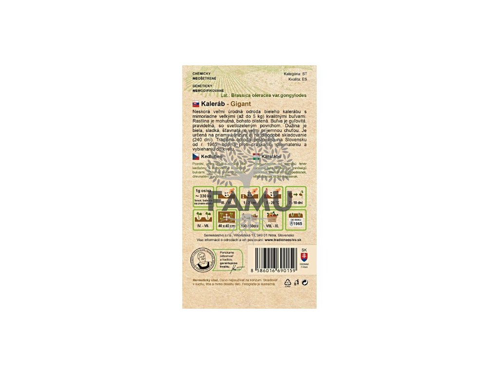 Neskorá veľmi úrodná odroda bieleho kalerábu s mimoriadne veľkými (až do 5 kg) kvalitnými buľvami. Rastlina je mohutná, bohato olistená. Buľva je guľovitá, pravidelná, so svetlozeleným povrchom. Dužina je biela, sladká, šťavnatá, s veľmi príjemnou chuťou. Je určená na priamy konzum aj na dlhodobé skladovanie (240 dní). Tradičná odroda pestovaná na Slovensku od r. 1965, odolná proti praskaniu, drevnateniu a vybiehaniu do kvetu. Obsah balenia: 1,5 g Počet semien v 1g: cca 250 - 300 ks
