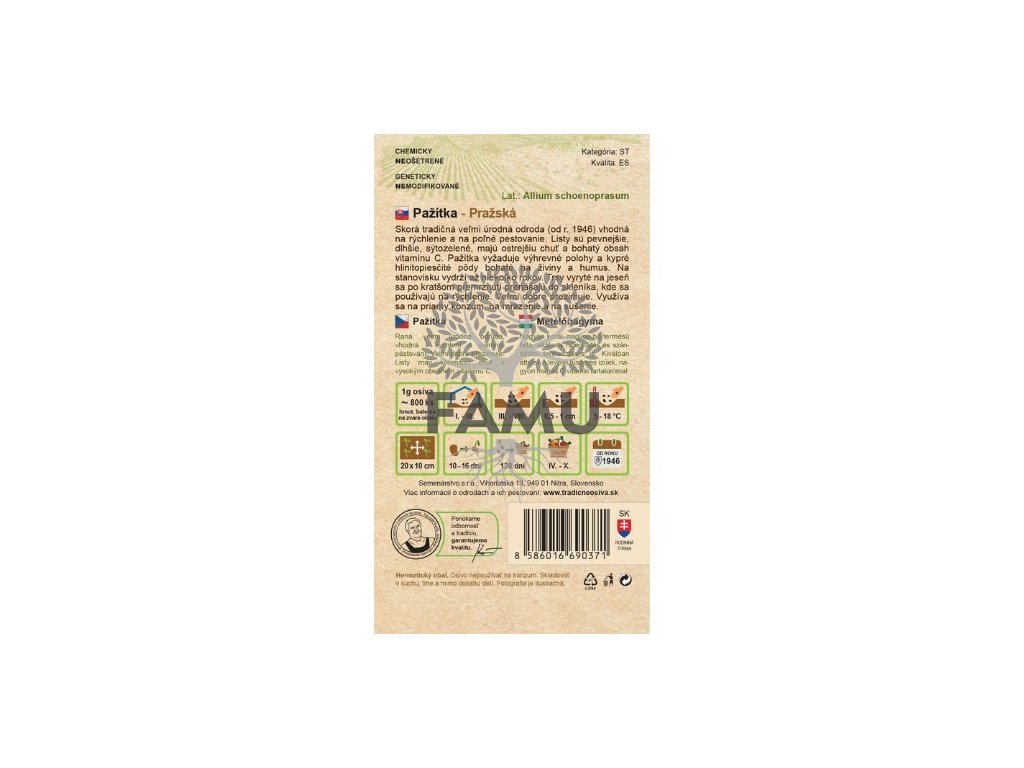 Skorá tradičná veľmi úrodná odroda (od r. 1946) vhodná na rýchlenie a na poľné pestovanie. Listy sú pevnejšie, dlhšie, sýtozelené, majú ostrejšiu chuť a bohatý obsah vitamínu C. Pažítka vyžaduje výhrevné polohy a kypré hlinitopiesčité pôdy bohaté na živiny a humus. Na stanovisku vydrží až niekoľko rokov. Trsy vyryté na jeseň sa po kratšom premrznutí prenášajú do skleníka, kde sa používajú na rýchlenie. Veľmi dobre prezimuje. Využíva sa na priamy konzum, na mrazenie a na sušenie. Obsah balenia: 3 g Počet semien v 1g: cca 750 - 1000 ks