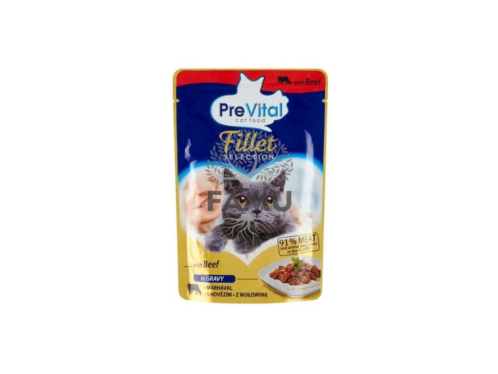 PreVital Fillet Selection s hovädzinou v omáčke je kompletné a vyvážené mokré krmivo pre dospelé mačky. Obsahuje až 80 % mäsa vo filetkách, z toho 4 % hovädzieho, ktoré poskytuje kvalitné bielkoviny pre zdravé svaly.