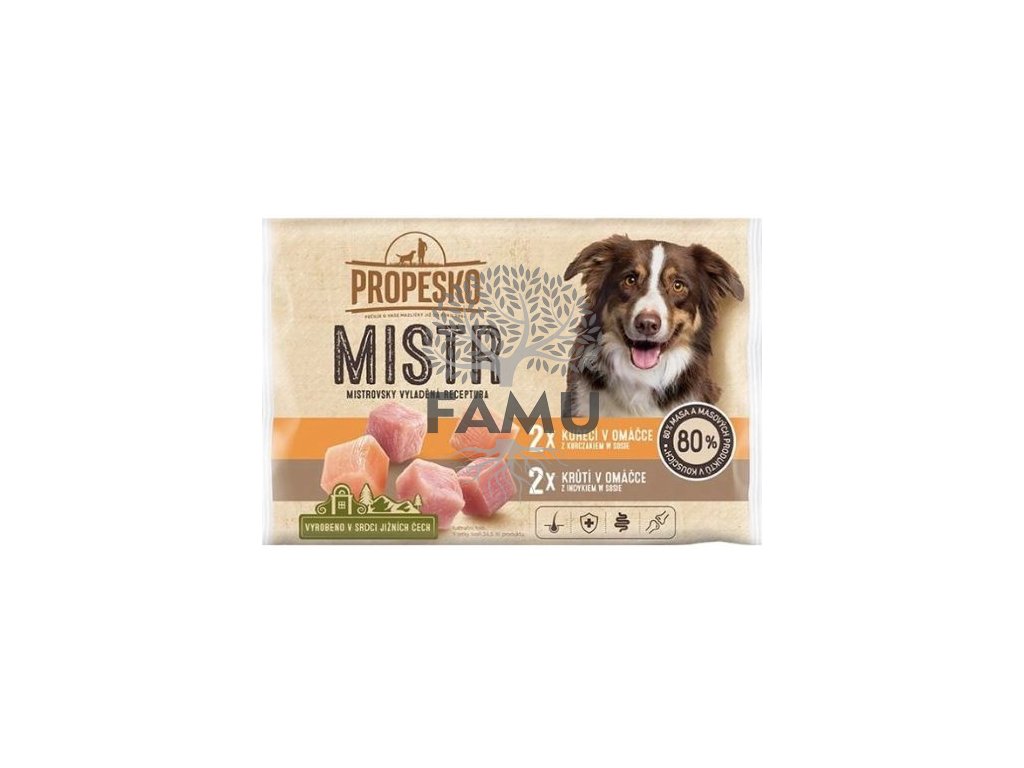 Propesko Mistr 4 x kapsička je kompletné a vyvážené mokré krmivo pre dospelé psy všetkých plemien. Obsahuje 80 % mäsa a mäsových produktov vo filetkách, z toho 4 % kuracie alebo morčacie mäso. Jemné kúsky mäsa v chutnej omáčke dodajú vášmu psovi energiu a všetky potrebné živiny.